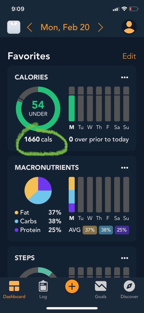 Looking from left to right. It shows I need 1714 calories each day to meet my goal weight. This is factoring in a consistent 1.5 lb weight loss per week. (far right). This is not far off from the calculated 1807 calories from above and is far easier on the brain cells. The middle picture depicts I didn’t meet my target caloric intake. It also breaks down my specific macronutrients (protein, carbs, fats) and where I could use some added energy.